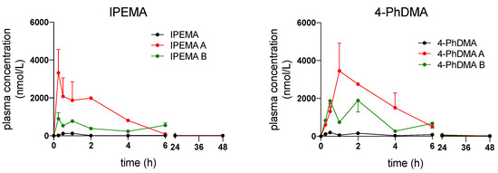 Figure 7 shows the comparison between the plasma concentration versus time curves obtained after the administration of the selected lipophilic compounds IPEMA and 4-PhDMA suspended in water and formulated in SEDDS.
