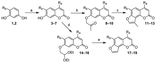 The starting 7-hydroxybenzopyran-2-ones (3–7) were synthesized by condensing the opportune resorcinol derivative (1, 2) with the appropriate acetoacetic ester derivatives. Compounds 3–5 were functionalized with α-chloroacetone, obtaining the O-α-ketoethers 8–10. The intermediate ethers were finally cyclized in an anhydrous alkaline medium that provided the desired 4′-methylangelicins 11–13. Alternatively, starting benzopyranones 3, 6, and 7 were condensed with chloroacetaldehyde diethylacetale, affording ethers 14–16, which were finally cyclized to angelicins 17–19 characterized by an unsubstituted furan ring.