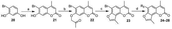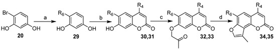 In this case, the 6-phenyl substituent was inserted via Suzuki coupling on the starting resorcinol 20, since we noted that Pechmann condensation on bromoresorcinol with hindered acetoacetic esters did not occur. The obtained 6-phenylresorcinol (29) was condensed with the opportune derivatives of ethyl acetoacetate, then functionalized with α-chloroacetone and finally cyclized to 4-alkyl-6-phenyl-4′-methylangelicins (34, 35).