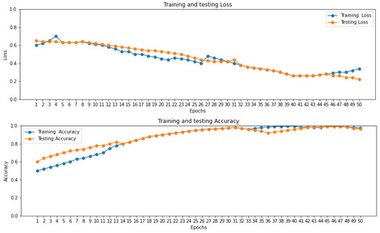 For each deep learning technique these testing techniques are applied in 10 epochs (10 feed-forward and feed backward paths). In each iteration for testing the model calculates its AUC, precision, F1 score, recall, Cohen’s kappa, specificity, sensitivity, Mathew’s correlation coefficient, loss, and accuracy. The following are the mathematical equations used to calculate the algorithms’ results [63,64,65,66]. The Equations (26)–(29) explain the formulae to calculate sensitivity, specificity, accuracy, and Mathews Correlation Coefficient (MCC) respectively.
