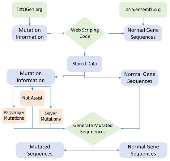 For the proposed study normal gene sequences are extracted from asia.ensambl.org [22] and mutation information of each gene related to breast cancer is extracted from intogen.org (accessed on 18 August 2022) [23]. These normal gene sequences and mutated information are extracted through web scraping code. Web scraping is the process of extracting data from different websites available on the World Wide Web [24]. There is more than 2500 type of cancer genomes involved in mutation [25]. Three types of mutations occur in human genes, namely driver mutation, passenger mutation, and not assist. Driver mutation is the type of mutation in cells that cause cancer. Driver mutation causes abnormal growth of the cells [26]. A mutation that alters the gene sequences but does not cause cancer is known as passenger mutation [27] whereas, not assist gene mutation does not contain any information about the mutation therefore it is not added to this study. The data collection is explained step by step in Appendix A.