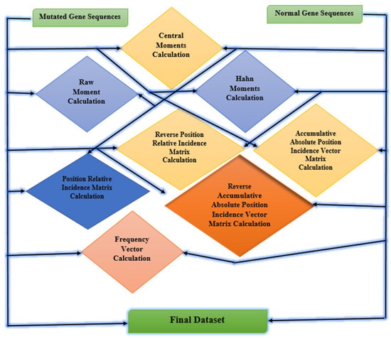 The main features of the raw dataset are extracted by feature extraction techniques. Feature extraction is the process of passing data through multiple steps to extract the main features used for model training. It is the most important step in training machine learning algorithms. In feature extraction, the patterns of data are recognized that are further used in the training and testing process performed on data [30,31]. For the proposed study statistical moments are calculated such as Hahn moments, raw moments, and central moments. Other feature extraction techniques are also used including PRIM, RPRIM, AAPIV, and RAAPIV. These feature extraction techniques are applied to mutated gene sequences and normal gene sequences for extracting the main features of data [32]. Figure 10 explains the feature extraction techniques used for the breast cancer dataset.