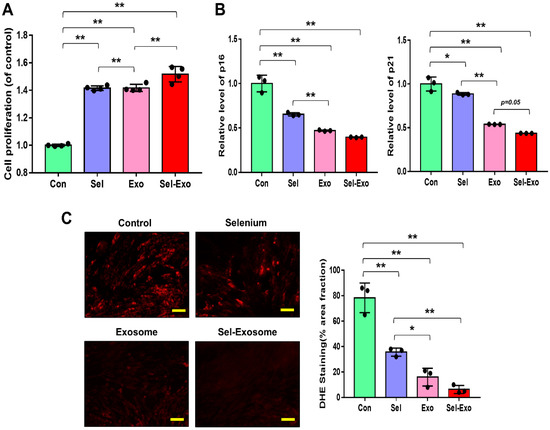 Proliferation activity of AdMSCs treated with selenium, exosomes, and selenium-treated exosomes. (A) The proliferation rates were determined after exposure to selenium, exosomes, and selenium-treated exosomes. (B) The mRNA expression levels of senescence-related p16 and p21 were evaluated by real-time PCR. (C) ROS levels were determined by dihydroethidium (DHE) staining using fluorescence microscopy (scale bar = 100 μm). A representative image of three independent experiments is shown. Data are expressed as the mean ± SD of three independent experiments. * Significant difference from control, p < 0.05. ** Significant difference from control, p < 0.01.