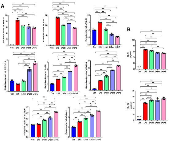 Effects of selenium, exosomes, and selenium-treated exosomes on the inflammatory response. (A) Relative gene expression related to pro-inflammation (TNF-α, IL-6, and IL-8) and anti-inflammation (TGF-β1 and IL-10) was evaluated by real-time PCR after LPS treatment. Relative gene expression levels of CD163, CD206, and Arg1 were detected. (B) A multiplex assay was conducted to detect the concentrations of IL-6 and IL-10 in the conditioned media. Data are expressed as the mean ± SD of three independent experiments. * Significant difference from control, p < 0.05. ** Significant difference from control, p < 0.01.