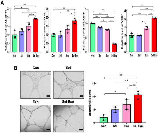 To investigate the effect of Sel-Exo on angiogenesis, HUVEC (Human Umbilical Vein Endothelial Cells) were used. The expression levels of pro-angiogenic genes, angiopoietin1 (ANGPT1) and flk1 (KDR), and of the anti-angiogenic gene, vasohibin-1 (VASH1), were analyzed by real-time PCR. We noticed the expression levels of ANGPT1, KDR and VEGF to be significantly enhanced in the Sel-Exo group than in the other groups, whereas the expression of VAHS1 was remarkably reduced in the Sel-Exo group, indicating that Sel-Exo could promote angiogenesis (Figure 5A). Based on the real-time PCR results, we carried out a tube formation assay to further investigate the effects on angiogenesis in vitro. As shown in Figure 5B, tube formation in the Sel-Exo group was significantly enhanced compared to that in the other groups. Taken together, the results demonstrated that Sel-Exo strongly improved the in vitro angiogenic potential by regulating both pro-angiogenic and anti-angiogenic genes.