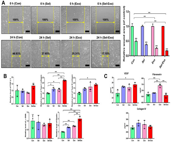 Migration of human dermal fibroblasts in the presence of selenium, exosomes, and selenium-treated exosomes. (A) Optical images of migrated fibroblasts were obtained from the in vitro scratch-wound-closure assay, and the relative migration rates of the fibroblasts were quantified (100× magnification, scale bar = 200 μm). (B) Relative mRNA expression levels were evaluated by real-time PCR. (C) Relative protein levels of the corresponding beneficial factors for wound healing were determined by multiplex assay. A representative image of three independent experiments is shown. Data are expressed as the mean ± SD of three independent experiments. * Significant difference from control, p < 0.05. ** Significant difference from control, p < 0.01.