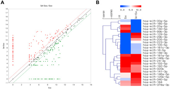Distribution of differentially expressed selenium-treated exosomes compared to exosomes. (A) Scatter plots show the differential miRNA expression between two samples. (B) Hierarchical clustering analysis indicates organized miRNA expression in wound repair.