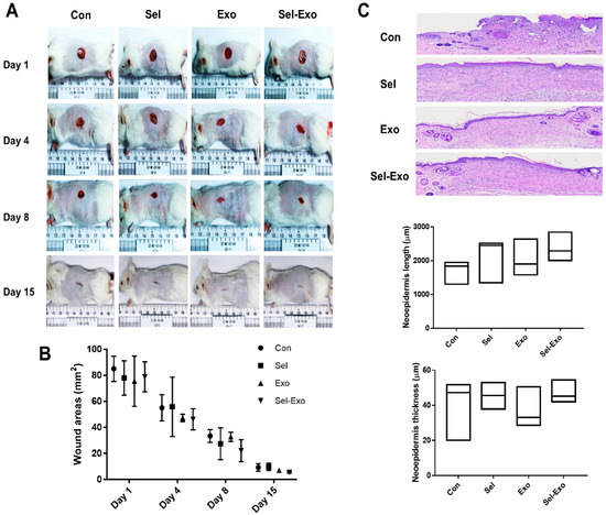 To further explore the effect of Sel-Exo on wound healing, an in vivo cutaneous wound healing assay was performed using ICR mice. Optical images of wounds treated with PBS, selenium, Exo or Sel-Exo were observed for 15 days. Equal volumes (100 μL) were subcutaneously injected into the mice, and the PBS-injected group was used as a control. All groups showed wound closure after 15 days in the optical images, without a significant difference in the wound area (Figure 8A). Notably, quantitative analysis showed that treatment with Sel-Exo resulted in enhanced wound repair compared to that in the other groups; however, the difference was not significant (Figure 8B). Among the groups, Sel-Exo showed the greatest increase in length and thickness of the neoepidermis, although the difference was not significant (Figure 8C). These results could possibly be attributed to the accelerated growth and migration of dermal fibroblasts along with upregulated beneficial factors for wound healing, as shown in Figure 6. Taken together, the findings confirmed the possibility of accelerated wound healing due to treatment with Sel-Exo derived from AdMSCs.