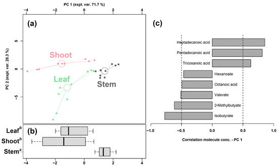rPCA model built on the concentration of the fatty acids that showed a statistically significant difference among shoots, leaves, and stems. In the scoreplot (a), samples from the three groups are represented with circles, triangles, and squares, respectively. The wide, empty circles represent the median of the samples of various samples. The position of the samples along PC 1 is summarized in boxplot (b). The loading plot (c) reports the correlation between the concentration of each substance and its importance over PC 1.