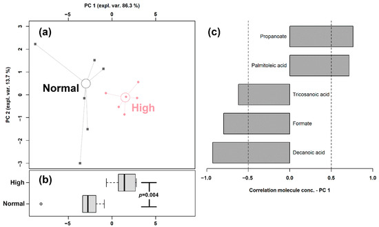 The first principal component of the two needed to robustly describe the samples and significantly summarize the peculiarities connected to the amount of bamboo shoots consumed (p < 0.05), with samples from the Normal and High intake groups appearing as low and high scores, respectively. The high concentrations of propanoate and palmitoleic acid represented the main features of the feces of giant pandas consuming high amounts of shoots, while higher concentrations of tricosanoic acid, formate, and decanoic acid characterized the Normal shoots intake group.