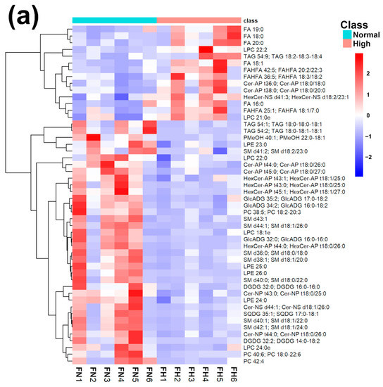 The established PLS-DA model exhibited a good ability to discriminate the groups from each other (R2Y > 0.5 and Q2 > 0.5), as shown in Figure S7. Furthermore, as shown in Figure 4a,b, the concentrations of unsaturated ceramides were more abundant when giant pandas consumed a high level of bamboo shoots. The result of the ChemRICH set enrichment statistics plot was coherent with these trends, as shown in Figure 4c. In detail, fatty acids clusters increased in the High bamboo shoot consumption group were triglycerides, unsaturated ceramides, diglycerides, lysophosphatidylcholines, and phosphatidylglycerols, while the following were decreased in the Normal group, namely sphingomyelins, saturated ceramides, saturated phospholipid ethers, and cerebrosides.