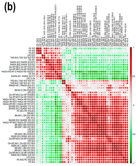 Similar to fecal samples, a set of multivariate investigations made by PLS-DA, heatmap, correlation plot, and ChemRICH set enrichment statistics plot was applied to the relative quantities of lipids obtained through untargeted UHPLC-HRMS/MS, aiming to highlight the key lipid pathways triggered by a high intake of bamboo shoots, as shown in Figure 4 and Figure S7.