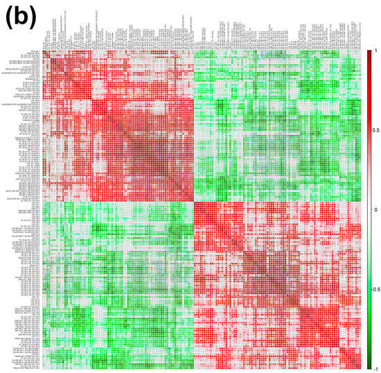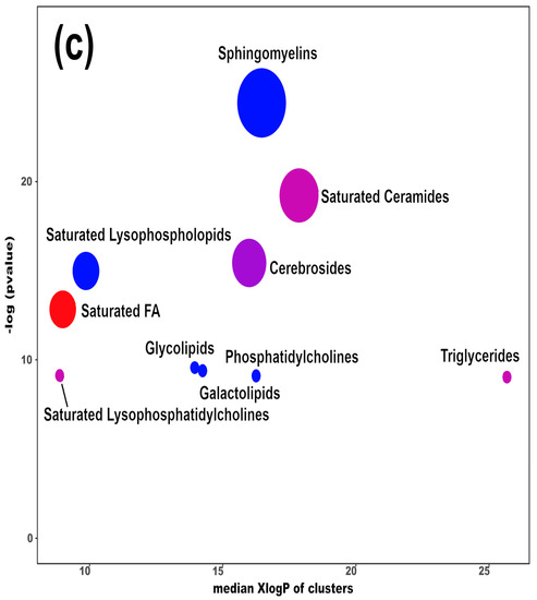The established PLS-DA model exhibited a good ability to discriminate groups from each other, as shown in Figure S6, which is suitable for explaining the differences among groups (R2Y > 0.5) and prediction (Q2 > 0.5). Furthermore, as shown in Figure 3a,b, the concentrations of saturated fatty acids were more abundant when giant panda’s consumed a higher level of bamboo parts, and such fatty acids showed positive correlations. Moreover, the result of the ChemRICH set enrichment statistics plot confirmed the above trends (Figure 3c). In detail, fecal fatty acid clusters increased in the high bamboo shoot consumption group was saturated fatty acids, while the following were decreased in the normal bamboo shoot consumption group, namely sphingomyelins, saturated lysophospholipids, glycolipids, galactolipids, and phosphatidylcholines.