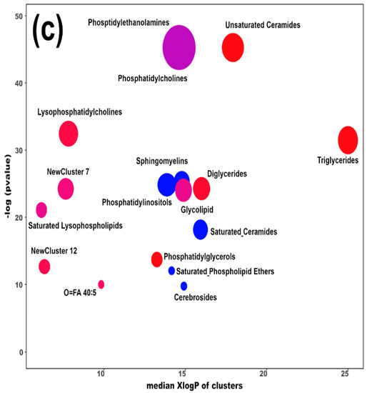 Data of UHPLC-HRMS/MS: The statistical analysis was limited only to the molecules quantified in each group of samples. The data were normalized against total peak areas before performing univariate and multivariate statistics. For univariate statistical analysis, the normalized data were calculated by a Student’s t-test. For multivariate statistical analysis, the normalized data were imported to SIMCA software (version 14.1, AB Umetrics, Umeå, Sweden), where the data were preprocessed by uv scaling and mean centering before performing PLS-DA. To avoid model over-fitting, a default 7-round cross-validation was performed, to determine the optimal number of principal components. ChemRICH analysis was performed based on the online ChemRICH software (http://chemrich.fiehnlab.ucdavis.edu, accessed on 25 June 2022).