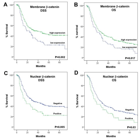 Figure 2A,B). Accordingly, positive nuclear β-catenin was also associated with a significantly poorer DSS and OS (Log-rank,