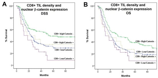 Figure 2C,D). Combining the infiltration by CD8+ TIL with the nuclear expression of β-catenin, the cases with high CD8+ TIL density and negative expression of nuclear β-catenin had the highest DSS and OS and the cases with low CD8+ TIL density and positive nuclear β-catenin expression had the lowest (