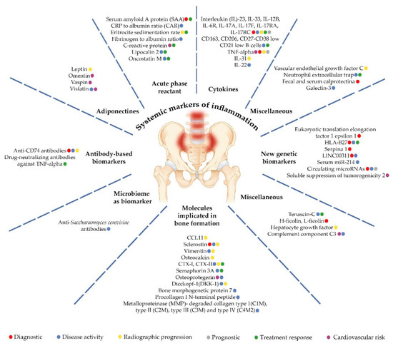 According to the World Health Organization, a biomarker is a chemical, physical, or biological indicator of disease presence, activity, or severity, which can provide vital information. In respect of axSpA, there is an unmet need for biomarkers that can help to diagnose the disease, define disease activity and prognosis, and establish personalized treatment approaches [5].