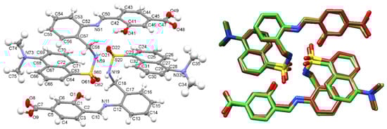 The molecular structure of two neighboring [H4L]+ cations is shown in Figure 1, as an ellipsoid diagram, which includes a labelling scheme equivalent to that used in the crystal structure of DsA (see below). Some significant crystal parameters and refinement data are summarized in Table S1. The asymmetric unit of [H4L]Cl·0.92H2O consists of two crystallographically independent cationic moieties of [H4L]+, showing their amine N atoms protonated (N33 and N73), two chloride counterions, and several water molecules with low occupation sites, which sum up to 0.92, per asymmetric unit. It must be noted that one of the chloride anions, as well as one of the dansyl residues (C63–C75) are disordered on two different occupation sites (0.832 and 0.168).
