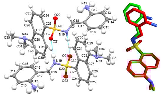 Moreover, we solved the crystal structure of the precursor DsA, which is shown in Figure 2. Details of the crystal data collection and structure refinement are also summarized in Table S1. Crystals of DsA consist of crystallographically independent molecules, whose main geometric parameters (Tables S2 and S3) are within the typical ranges observed for other dansyl derivatives [,,,]. Mutual intermolecular N(19)-H(19A)···O(21)#3 bonds allow connecting two contiguous molecules to form H-bonded dimers, as occurred for its derivative [H4L]Cl·0.92 H2O as well. Sulfonamide oxygen atoms of DsA are additionally connected to other adjacent molecules through the amino group N(11)-H(11B)···O(21)#4 (Table S6), as typically observed for dansyl [] and tosyl [] derivatives.