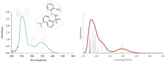 Experimental (left) and theoretical (right) profiles for the electronic spectrum of DsA. The signal assignment of the two moieties of the molecule has been included as a schematic. The orange arrows show the bands associated with the dansyl moiety, and the green arrow shows the band associated with the aniline moiety. Vertical lines indicate individual electronic transitions listed in Table 1.