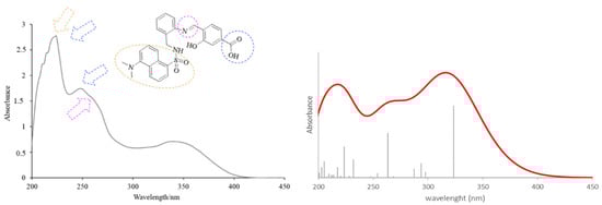 Experimental (left) and theoretical (right) profiles for the electronic spectrum of H3L. The signal assignment of the main groups of the molecule has been included as a scheme. The orange arrow shows the bands associated with the dansyl moiety. The blue arrows show the band associated with the carboxylic group and the pink arrow shows the band associated with the azomethine group. Vertical lines indicate individual electronic transitions listed in Table 1.