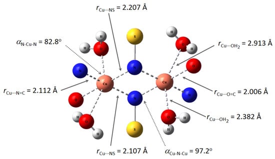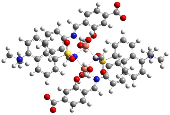 The geometrical structure of the copper(II) complex has been analyzed by means of theoretical methods. Based on experimental results (CHNS analyses, infrared, and electronic spectra) and previous studies [,,], we were able to obtain the optimized geometry of a sulfonamido-bridged dimeric complex represented in Figure 6. The structure is symmetric, with an inversion center in the middle of the distorted square formed by the two sulfonamido bridges. A detailed analysis of the metal ion environment shows a six-coordination pattern comprising the expected N,N,O binding site of a ligand unit, a sulfonamido N-bridge of the neighboring ligand unit, and two monodentate water molecules completing its coordination sphere. A comparison of this optimized structure with a related dimeric copper(II) complex, which is also bridged by sulfonamide N atoms, showed a great similarity. The reported complex shows Cu-N distances in the range 1.969(4)-2.004(4) Å, and bond angles in the range 85.12–98.4 [].