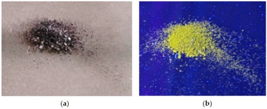 The effect of UV light (365 nm) on a powdery sample of H3L-CuO NPs; (a) under natural light, (b) under UV light (365 nm).