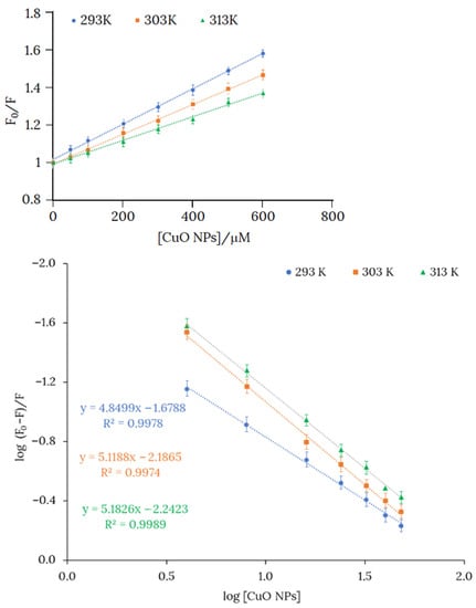 The number of interaction binding sites (n) were determined by the Scatchard Equation (1), where F0 and F are the relative fluorescence of H3L in absence and presence of NMs, respectively, KB is the binding constant, and [Q] is the quencher concentration []. The Scatchard equation linear graph of H3L and NMs is shown in Figure 8 (bottom). The number of binding sites (n) is around 5 at 293 K, suggesting five binding sites for H3L on the CuO NPs surface. The interaction ratio increased slightly with rising temperature, probably because temperature favors the reactivity of superficial Cu2+ ions.