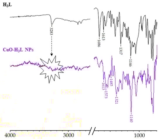 Partial view of the ATR-FTIR spectra of the free ligand (top) and CuO-H3L NPs.