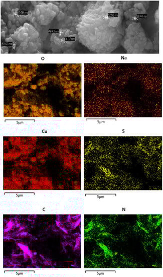 (Top): SEM micrograph of H3L-CuO NPs. (Bottom): EDX mapping pattern of the element distribution: Cu, O, S, N, C, and Na.