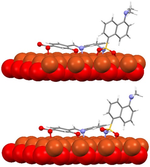 Several models have been considered to mimic the interaction between H3L and CuO NPs using DFT calculations [] (Figure S11). The largest models studied comprise a single unit of the ligand interacting with a sheet of 32 units of CuO. The geometry of these surfaces has been taken from one of its common crystallographic structures (available from CSD) and choosing that facet containing the largest number of copper atoms suitable to interact with the ligand, in this case, the (1,0,0) facet. The size of the largest models has been chosen to allow a complete interaction between H3L and the NPs surface. Particular attention has been devoted to establishing the preference of a dianionic (as phenolate and sulfonamide anion) or a monoanionic (only as phenolate) form of the ligand to interact with the superficial Cu2+ ions on the NPs. Figure 12 shows the DFT models for the interaction of CuO NPs with these dianionic and monoanionic forms of the ligand.