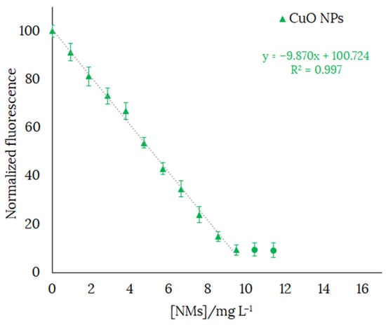 The unique properties of metal and metal oxide nanomaterials have led to their widespread use in daily life [,,,,], which has the clear negative effect of an increasing release of these nanomaterials into the environment [,,,,]. Particularly, CuO NPs are manufactured on a large scale for their varied industrial and domestic applications, as they are generally considered to be non-toxic. Thus, one of the common usages of CuO NPs is in water treatment, as an effective adsorbent of several pollutants []. However, some concern is arising about the possible adverse health and environmental effects of their release since several studies claim that CuO NPs could have negative impacts on different living organisms [,,].