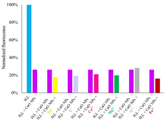 In view of the affinity of H3L to CuO NPs, we studied the selectivity of H3L as a probe for the cited NPs. As a criterion for interference, a ±10% variation of the average fluorescence intensity was used. The selectivity of H3L as a probe for CuO NPs was tested in the presence of common metal ions in water, such as Na+, K+, Mg2+, Ca2+, Fe3+, and Al3+ metal ions, in the same concentration as CuO NPs (Figure 14). These results showed that the cited species do not significantly interfere with the detection of CuO NPs. Al3+ ions can be tolerated in concentrations of at least 4 ppm without interference.