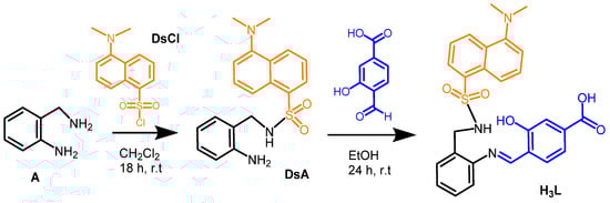 We investigated the ability of the dansyl-based fluorescent Schiff base ligand H3L for detecting CuO NPs in ethanol-water solutions, with short response time and sensing at basic pH. H3L can be easily synthesized (Scheme 1) from the condensation of 4-formyl-3-hydroxybenzoic acid with N-(2-aminobenzyl)-5-(dimethylamino)naphthalene-1-sulfonamide (DsA). This dansyl-derived amine had been previously obtained by selective reaction of 2-(aminomethyl)aniline with dansyl chloride []. H3L displays an N,N,O-binding domain suitable to interact with Cu2+ ions, either in solution, or as constituents of a solid matrix as CuO NPs. In this case, additional O atoms belonging to carboxylate and sulfonamide groups can also be involved in the interaction.