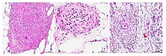 Figure 1. Rats’ arteriolar thickening after exposure to diabetic tissue cell-free filtrate. (A) Image showing luminal collapse of arterioles derived from the granulation tissue of a diabetic donor exhibiting intima hyperplasia, media layer thickening, hypercellularity, and concentric collagen of hyaline aspect. H/E. Magnification ×20. (B) Rat’s arteriolar walls thickening with luminal collapse in which intima and media layers appear hyperplastic with hypercellularity and fused as a result of infiltrated diabetic tissues homogenate. H/E. Magnification ×40. (C) Concentric adventitial collagen accumulation and hypercellularity around an arteriole in a rat treated with diabetic tissues homogenate. H/E. Magnification ×20.