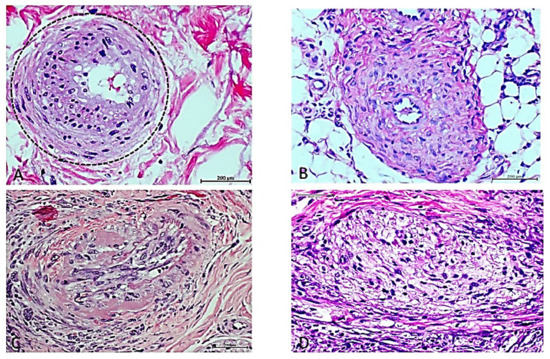 Figure 2. Rats’ arteriolar remodeling after exposure to non-diabetic arteriosclerotic arterial tissue. (A) Human donor arteriole with an active process of intimal hyperplasia, subendothelial infiltration, luminal narrowing and concentric expansion of the media layer with large basophilic nuclei. H/E. Magnification ×40. (B) Vascular response to human arteriosclerotic material in which a rat arteriole exhibits wall thickening, abnormal cellular infiltration, and disorganization. There is an exaggerated accumulation of collagen bundles. The lumen is obliterated. H/E. Magnification ×40. (C) Human donor arteriole showing degenerative wall changes including accumulation of hyaline material and internal tunica elastica fragmentation. Endothelial cells are hypertrophied and intermixed with fibroblast-like cells that appear to emerge from the endothelial collar and make up a mesh-like structure that encroaches into the lumen. H/E. Magnification ×40. (D) Rat’s arteriole with luminal invasion by protruding fusiform-like cells that emerge from the endothelial side and project into the lumen, forming a trabecular structure. The luminal mesh is infiltrated by round basophilic nuclei, suggestive of lymphocytes and other of fibroblastic aspect. H/E. Magnification: ×40. Scale bar: 200 µm.