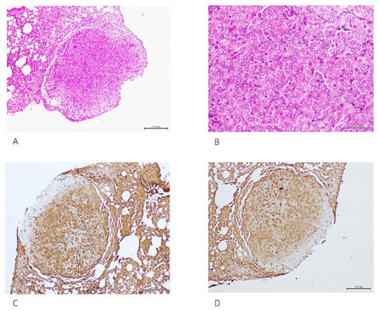 Figure 3. Lung solid tumor nodule detected at the early autopsy time point. (A). Well-consolidated tumor nodule with parietal, sub-pleural growth. The histological analysis identified poorly differentiated epithelial cells with vacuolated cytoplasm, vesiculous nuclei and prominent nucleoli, (B). This tumor was concluded as a poorly differentiated adenocarcinoma reactive to CEA and TTF-1, (C,D) respectively. H/E. Magnifications: ×4 and ×40. Scale bar: 200 µm.