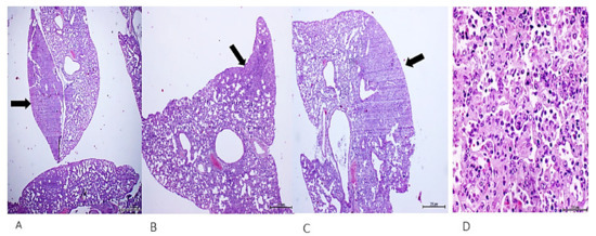 Figure 5. Autonomous growth of lung tumors. Mice treated with the sarcoma homogenate for 32 days and left to evolve free-of-treatment for other 35 days, exhibited lungs parenchymal consolidated areas (AC) that were histologically concluded as poorly-differentiated adenocarcinomas. H/E. Magnification: ×4 from (AC) and ×40 for (D). Scale bar: 200 µm.