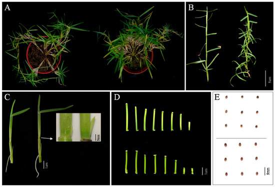 Centipedegrass (Eremochloa ophiuroides (Munro) Hack.) is a perennial warm-season C4 grass originating from China with wide adaptability, high barrenness and acid tolerance [1,2]. It has great potential use for soil conservation and environmental remediation and as a forage grass [3]. As a perennial turfgrass, centipedegrass is propagated by stolons and seeds, which directly depend on the continuous tillering of stolon nodes [4,5]. However, the regulatory mechanism in the development of tillering in centipedegrass has not been reported.