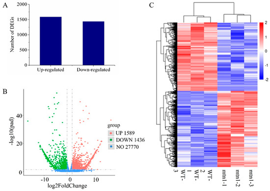 Expression levels of DEGs in the mtn1 mutant compared with those in the WT. (A) His togram chart of DEGs. (B) Volcano plots of DEGs. (C) Heatmap of DEGs. Colours from blue to red represent gene expression intensity, ranging from low to high.