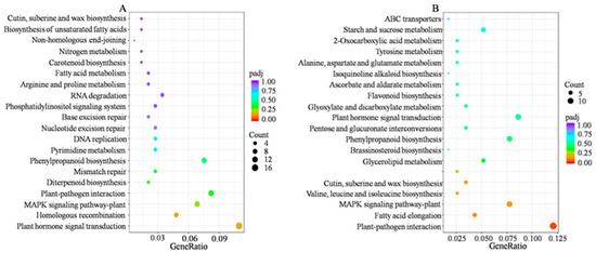 Top 20 KEGG classifications of upregulated DEGs (A) and downregulated DEGs between the mtn1 mutant and WT (B). High and low p values are represented by blue and red, respectively.