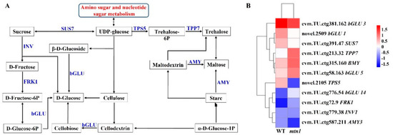 DEGs involved in starch and sucrose metabolism. (A) Pathway in starch and sucrose metabolism, (B) Heatmap of DEGs involved in starch and sucrose metabolism. The expression data are the TPM values of the samples; red indicates upregulated expression, and blue indicates downregulated expression.