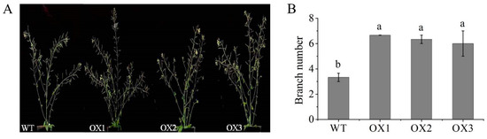 To further explore gene function, the EoABCB11 gene was transferred into wild-type Arabidopsis. A total of eight transgenic lines were acquired, and six lines showed similar phenotypes. Three of the six transgenic lines were selected to measure the branch number. Compared with the wild-type (WT) plants, the overexpressed transgenic lines showed higher branch numbers (Figure 6).