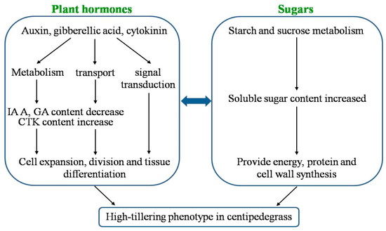 Based on expression analysis of hormone and sugar-related genes, hormone and sugar contents and the results of previous studies, we propose a regulatory network model to explain the role of plant hormones and sugars in the control of high tillering in centipedegrass (Figure 7). We propose that plant hormones and sugars play primary regulatory roles in centipedegrass tillering. IAA and GA are negative regulators, and CTK is the positive regulator. The biosynthesis, transport and signal transduction of IAA, GA and CTK are required for fast cell expansion, division and tissue differentiation in high tillering. The increase in soluble sugar content provides a greater energy source, which improves protein and cell wall synthesis in the tillering of the mtn1 mutant. The interaction between the hormones and sugars results in the tillering of the mtn1 mutant.