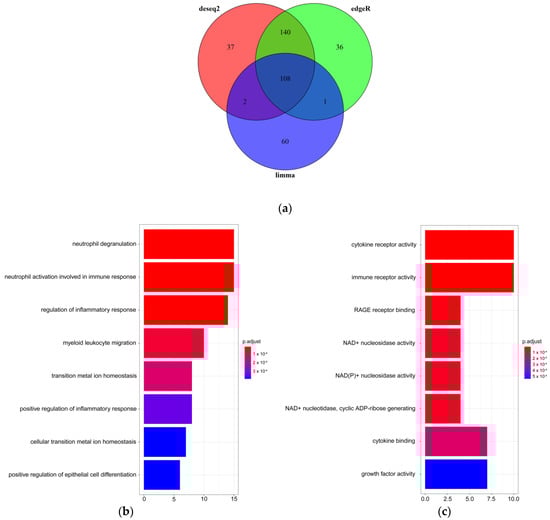 DEGs and related pathways of bulk RNA-seq. (a) Venn diagram of DEGs by three differential expression algorithms (DEseq2, LIMMA, and edgeR); (b,c) The top significantly overrepresented GO BP and MF terms. The x-axis represents the count of genes. The y-axis indicates the items of GO BP. The color represents the value of the FDR-adjusted p-value.