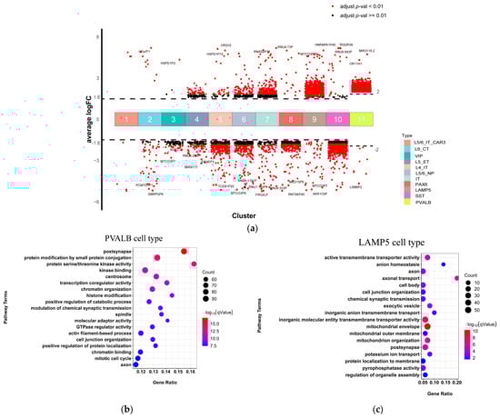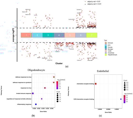 Non-neuronal type-special DEGs and related pathways of scRNA-seq. (a) Differential gene expression analysis showing up- and down-regulated genes across all seven non-neuronal clusters. An adjusted p-value < 0.01 is indicated in red, while an adjusted p-value ≥ 0.01 is indicated in black; (b,c) The top significantly GO terms. The x-axis represents the gene ratio, the y-axis indicates the items of GO, the color of dots represents the value of −log (FDR adjusted p-value), and the size of dots represents the count of genes.