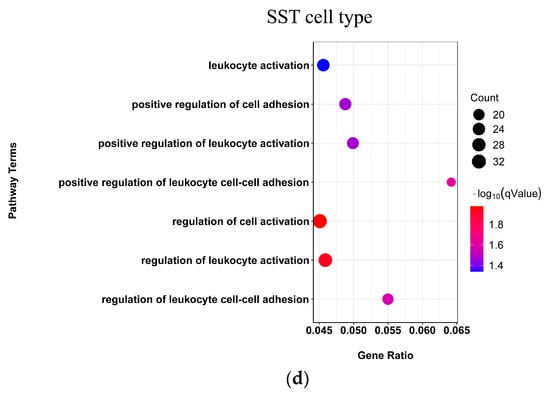 Next, we investigated the patterns of expression difference of DEGs in each cell type in SCZ. Based on the gene expression profiles of each cell type from the CRBERSORTx groupmode analysis, we compared gene expression profiles from SCZ and control samples for each cell type following CIBERSORTx guidelines [22]. At the threshold of false discovery rate (FDR) of <0.05 and |log2 fold change| > 1.6 (PVALB cell type |log2 fold change| > 1.6), we identified the DEGs for each neuronal cell type (Figure 3a; Table S1). PVALB, SST, and LAMP5 neurons had the largest number of DEGs. We conducted a functional enrichment analysis on DEGs of each cell type, respectively (Figure 3b), to identify SCZ-associated pathways shared across neuronal cell types and those specific to individual cell types. First, we observed that the PVALB neuron was significantly enriched with gene ontology terms related to the modulation of chemical synaptic transmission, synaptic signaling, postsynapse, and dendrite (Figure 3b). We then found that the LAMP5 neuron was significantly enriched with gene ontology terms related to axodendritic transport, chemical synaptic transmission, axon development, anion transmembrane transport, axon, and postsynapse (Figure 3c). Moreover, functional enrichment analysis indicated that the terms chemical synaptic transmission and postsynapse were enriched in DEGs in both PVALB and LAMP5 neurons. This result suggested that both cell types were involved in chemical synaptic transmission dysregulation in schizophrenia. SST cell type was significantly enriched with gene ontology terms related to positive regulation of neutrophil degranulation and positive regulation of leukocyte cell-cell adhesion (Figure 3d). This result suggested that SST cell type was associated with immune function dysregulation in schizophrenia. No significance was observed for any of the other cell types.