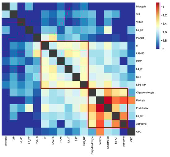 Heatmap showing neuronal and non-neuronal cell types grouped based on Jaccard similarity of the DEGs. Rows and columns correspond to cell types, and the intersection represents the Jaccard similarity between the two cell types. The red box indicates the cell types that converge to a module.