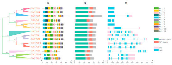 Conserved motifs, domain distribution and gene structure of N.sibirica CIPK genes. (A) Conserved motif distribution of NsCIPK genes. (B) Domain distribution of NsCIPK genes. (C) Gene structure of NsCIPK gene families.