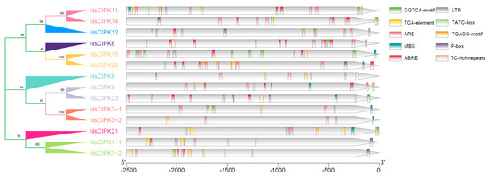 A cis regulatory element is a target nucleotide sequence that can be bound by different trans-acting factors, which are involved in the regulation of gene expression. We used PlantCare online tools to identify cis regulatory elements within the sequence region 2500 bp upstream of the start codon of each NsCIPK gene. On average, we could identify ten cis regulatory elements within these regions (Figure 4). These cis regulatory elements are mainly related to hormone response, salt, low temperature, and drought stress, which suggests that NsCIPKs may respond to hormones and abiotic stress.
